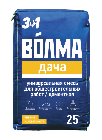 Универсальная цементная смесь «ВОЛМА-Дача » для общестроительных работ: для каменной и кирпичной кладки; для выравнивания стен (подвалов, гаражей, фасадов зданий) слоем от 10 до 20 мм; для ремонта старой штукатурки, заделки трещин; для предварительного выравнивания полов слоем от 20 до 55 мм, ремонта старой стяжки. Для наружных и внутренних работ. Для ручного нанесения.
